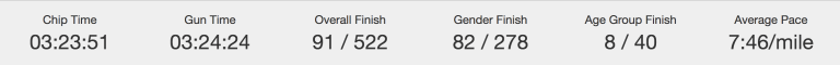 For this race, I took one full gel (22g of carbs) a few mins before the race, and then a half gel every two miles (meaning I was consuming roughly 44g of carbs per hour). Still on the low end according to the experts, but it represents progress not only in my thinking, but more importantly in my execution, and I simply cannot deny it has made a difference. I’d go as far to say that I felt better at the end of this marathon than I have done in any previous race.